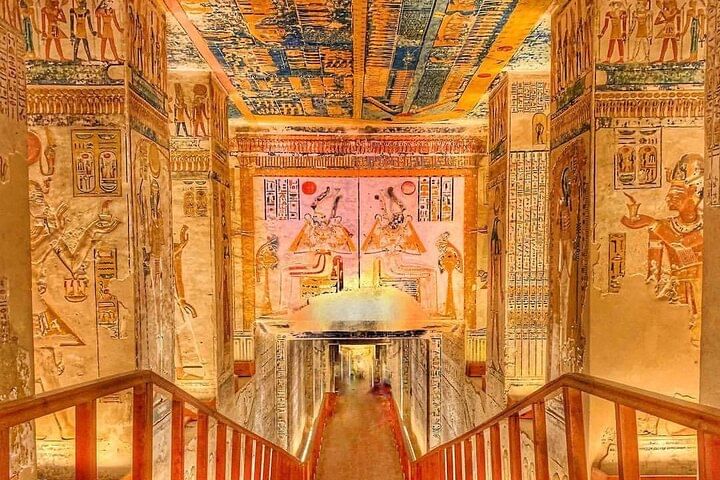 Next, journey into the heart of ancient royalty at the Valley of the Kings. Here, you’ll step inside the elaborately decorated tombs of legendary rulers such as Tutankhamun and Ramses VI.