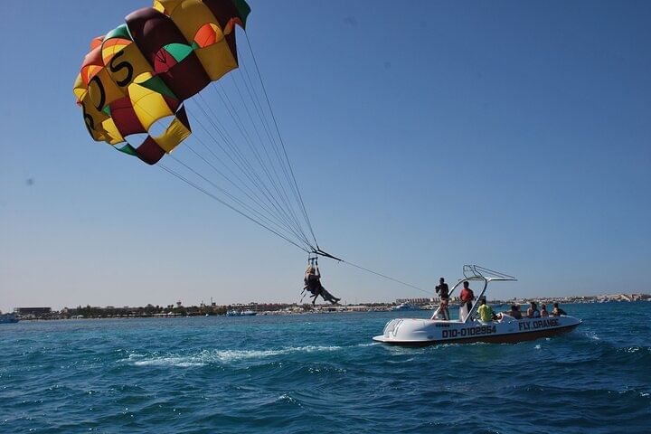 Then, elevate your experience—literally—with parasailing. Feel the rush as you're gently lifted into the sky, soaring high above the Red Sea with panoramic views of the coastline and islands around you. It’s the perfect way to add thrill and awe to your day on the water.