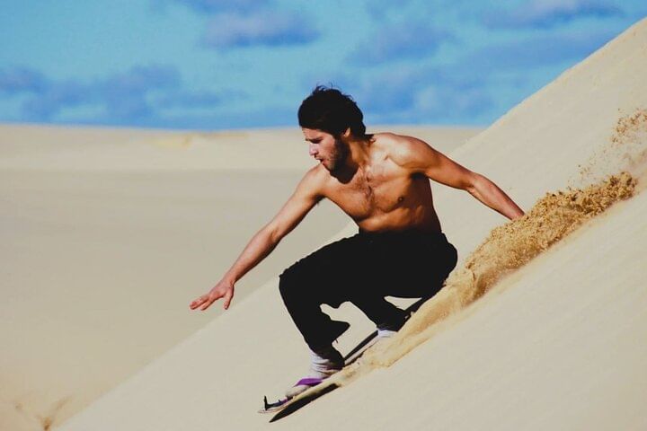 Feel the excitement of sandboarding in Agadir, Morocco! Ride the dunes, indulge in traditional Moroccan dishes, and enjoy refreshing drinks. Take in breathtaking ocean views and uncover hidden caves. Book your adventure now for an unforgettable experience!