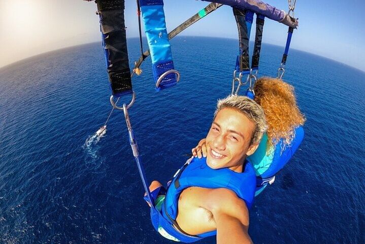 Enjoy an unforgettable parasailing adventure in Sharm El Sheikh, complete with private transportation for a hassle-free experience. Feel the thrill as you're lifted high above the sparkling waters of the Red Sea by a speedboat. From your elevated vantage point, take in panoramic views of the vibrant coastline, turquoise waters, and surrounding landscapes.